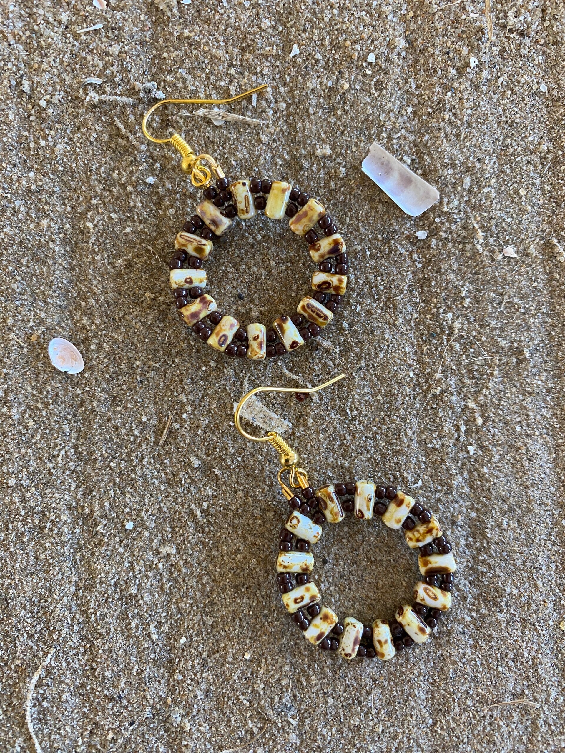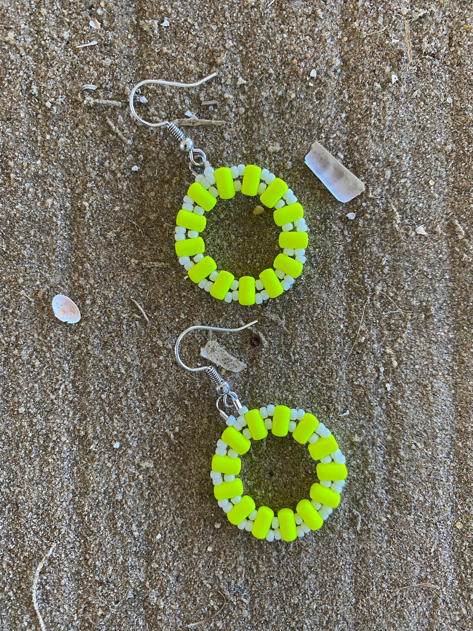 Aan de oorbel een handgemaakte hanger van twee soorten glaskralen in een ronde vorm. De korte kokertjes zijn verbonden door kleine ronde glaskraaltjes.