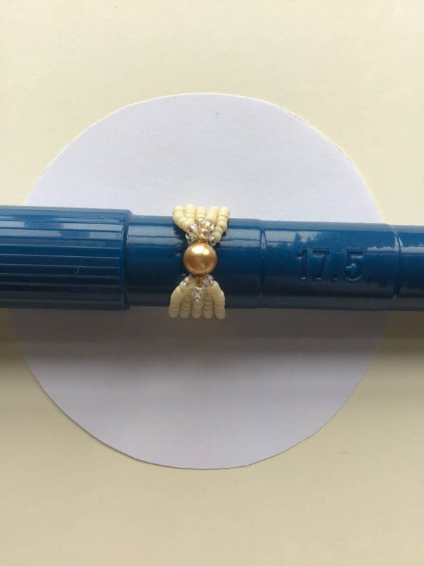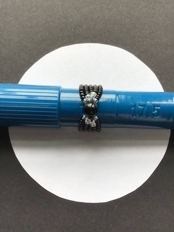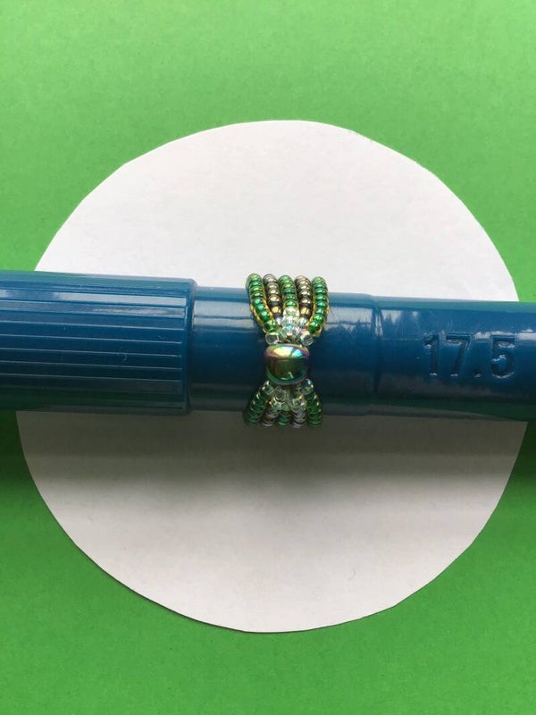 De ring heeft als centraal middelpunt een mooie glasparel. Deze is gevangen tussen 5 strengen kleine glaskraaltjes.