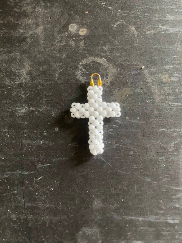 Bedel Kruisje is een leuke bedel voor aan de basis bedelarmband. Het 3-D kruis is gemaakt van kleine ronde glaskraaltjes en is mooi van vorm.