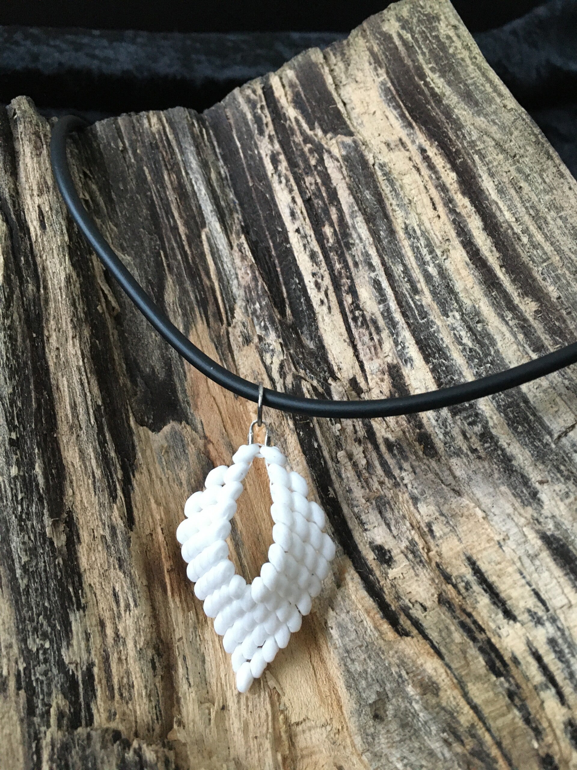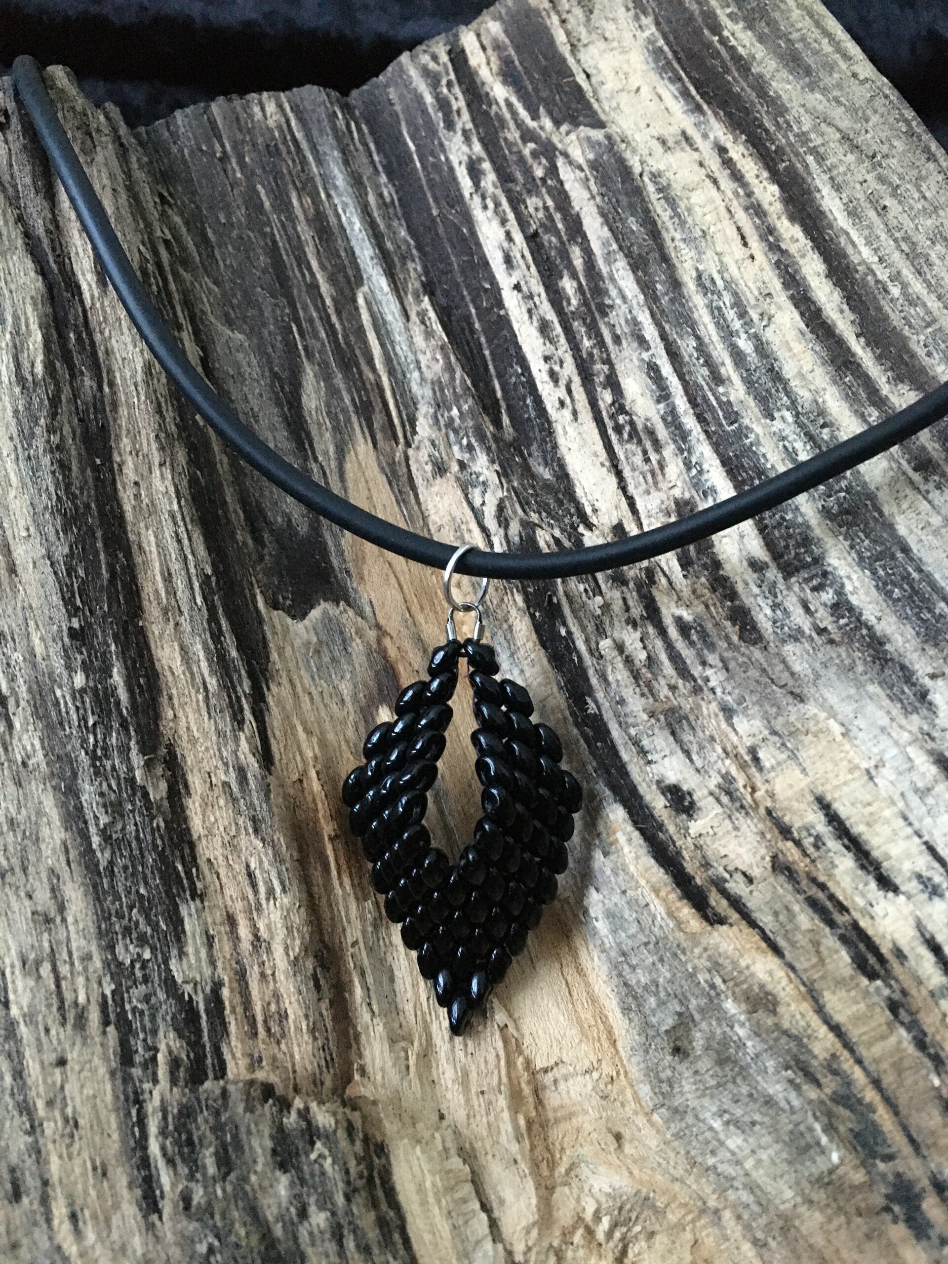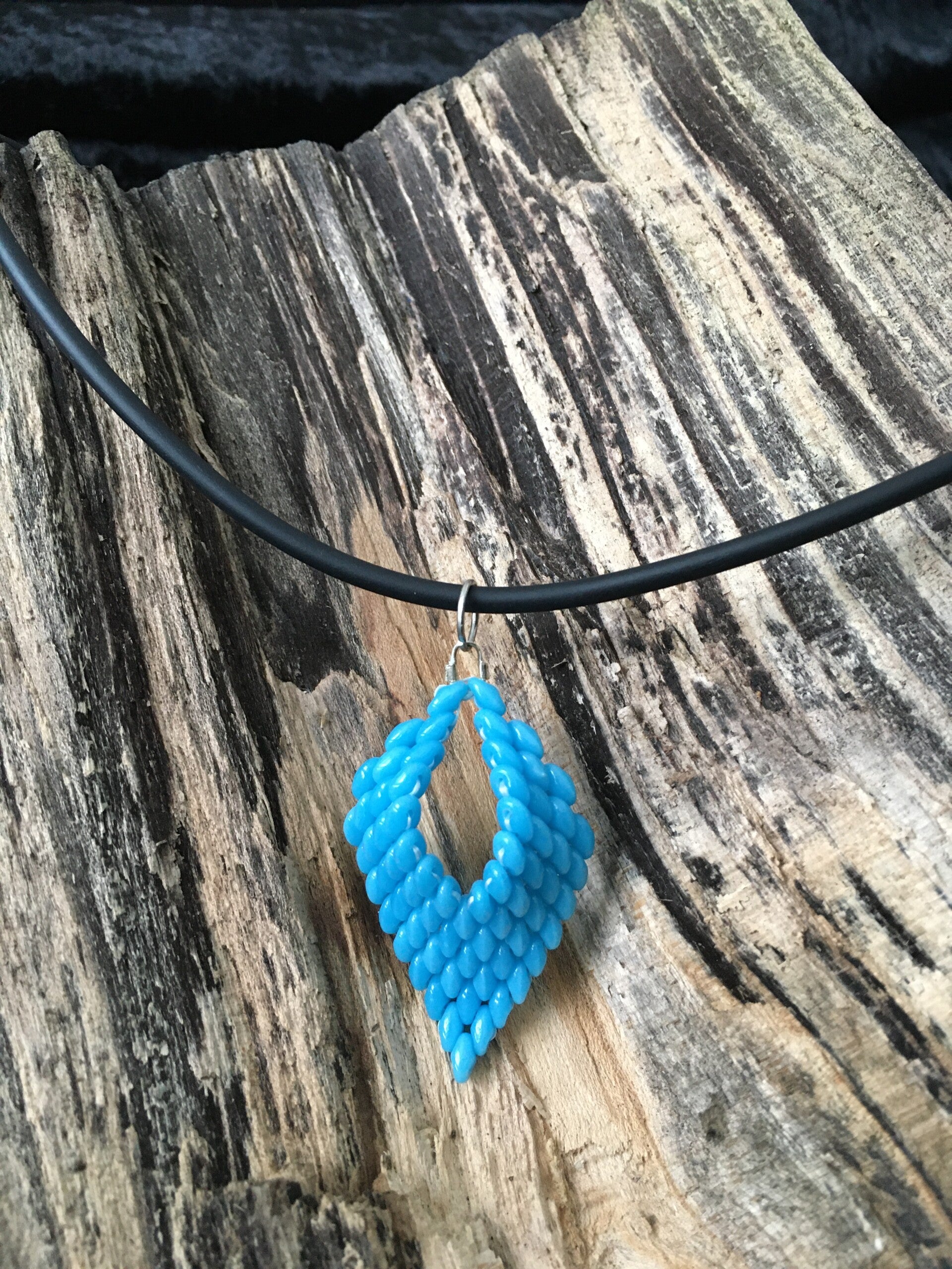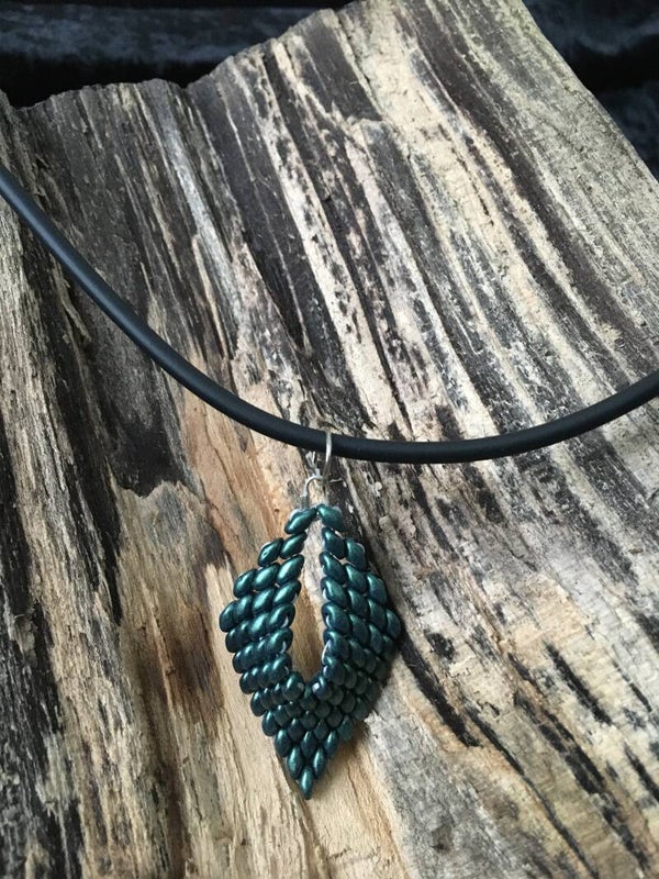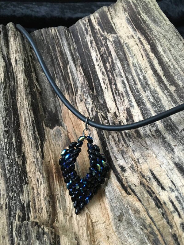 Handgemaakte ketting met hanger van glaskralen.