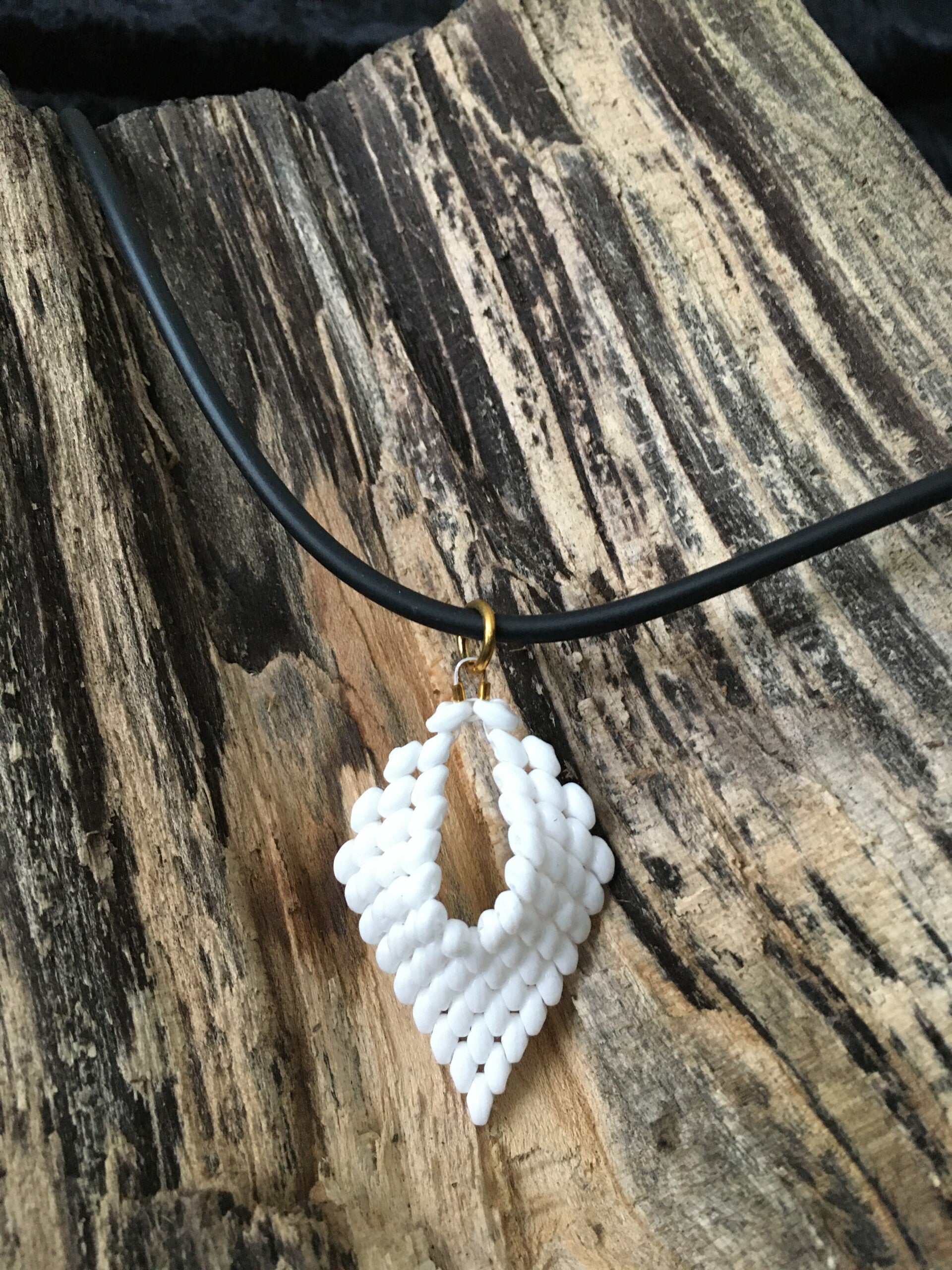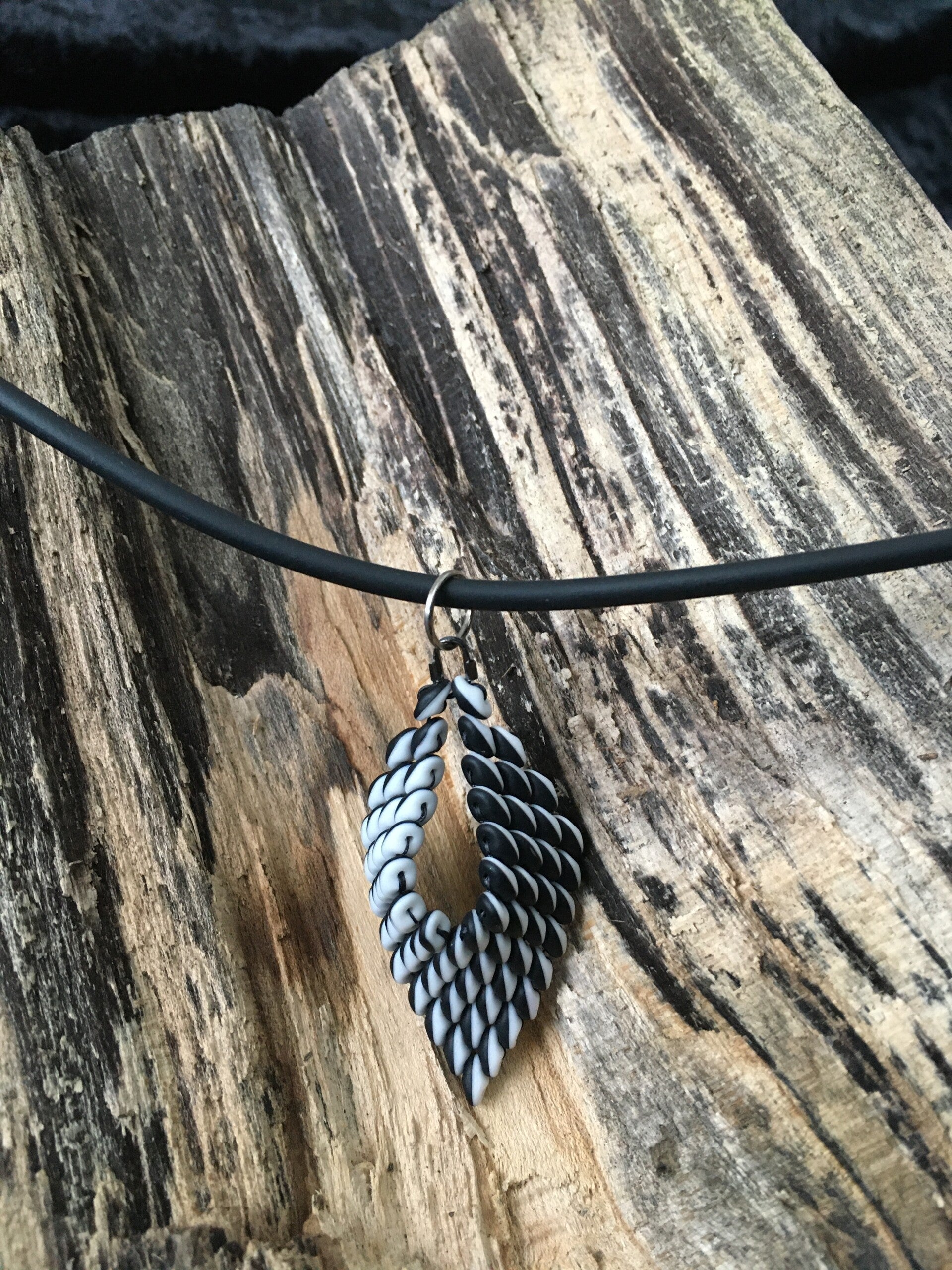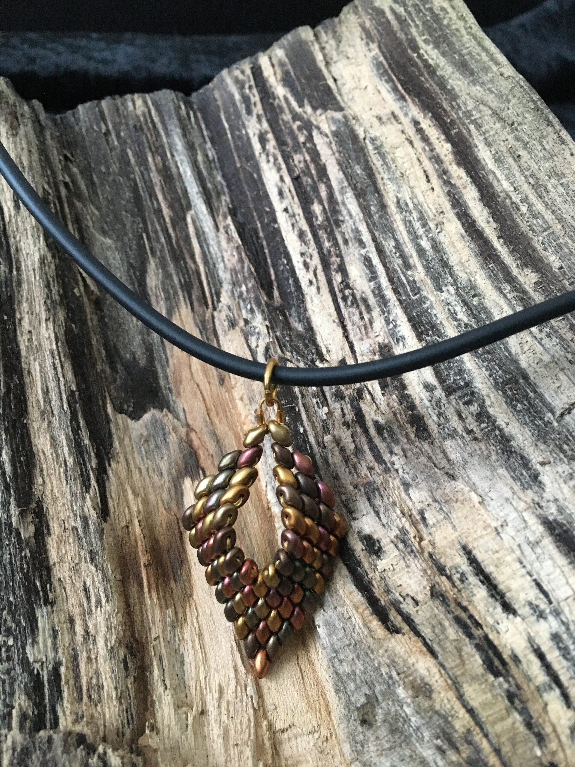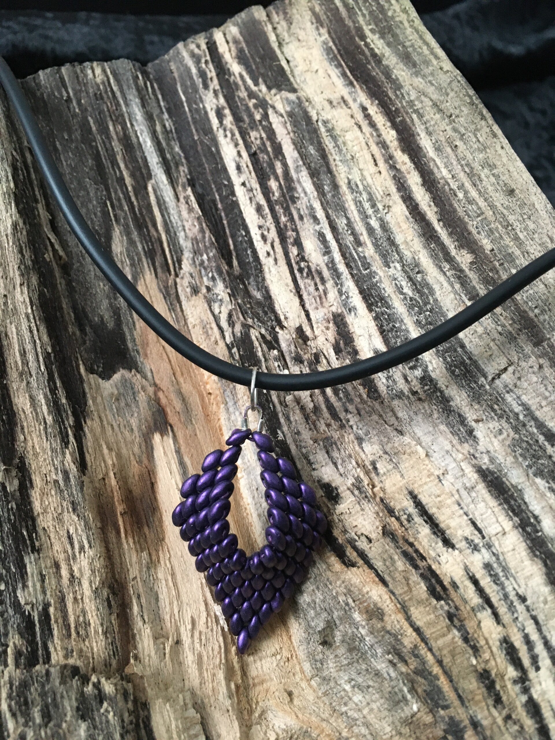 Handgemaakte ketting met hanger van glaskralen.